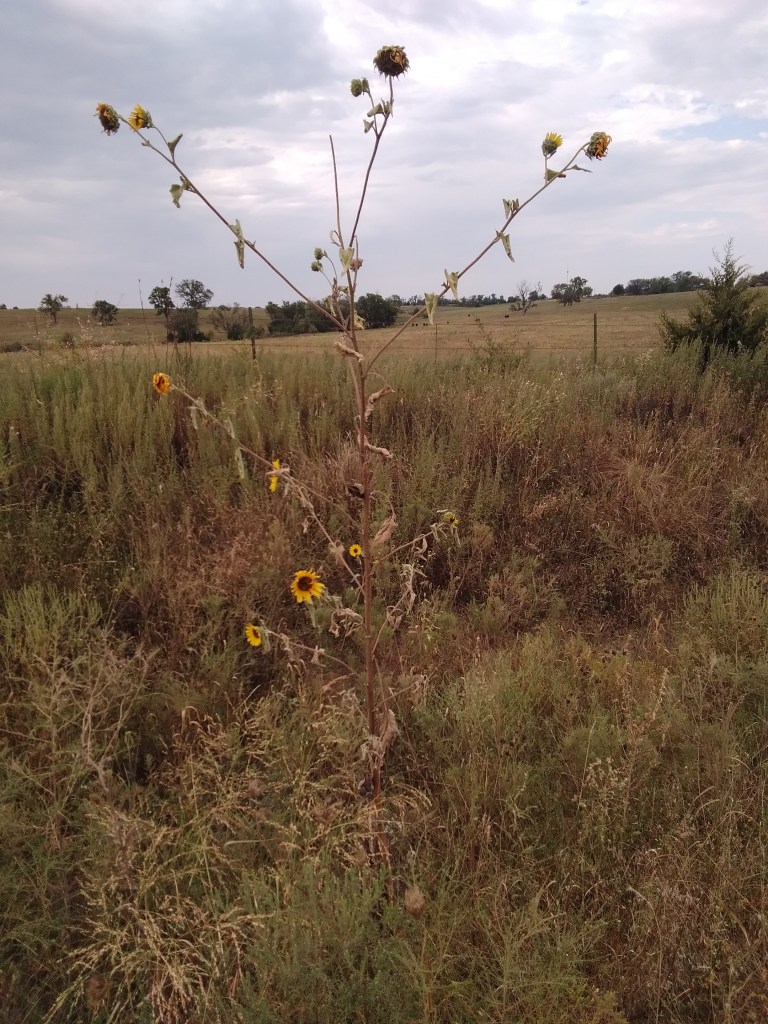 Kansas is known for sunflowers. They are not evenly distributed throughout the state. Northern Kansas has fields of wild sunflowers, while in southeast Kansas they have been a rare sight. In the 15 years I have lived in my current house this is the first year sunflowers are growing in the right of ways. These pictures were taken a few miles from my house this morning.
